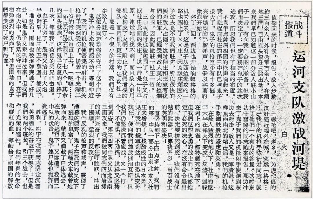 1942年2月,為牽制敵人對抱犢崮山區(qū)的掃蕩,運河支隊在運河南岸杜莊,打退了400多名日偽軍的進(jìn)犯,斃敵60多名,取得了戰(zhàn)斗的勝利,圖為當(dāng)時《大眾日報》的戰(zhàn)斗報道。