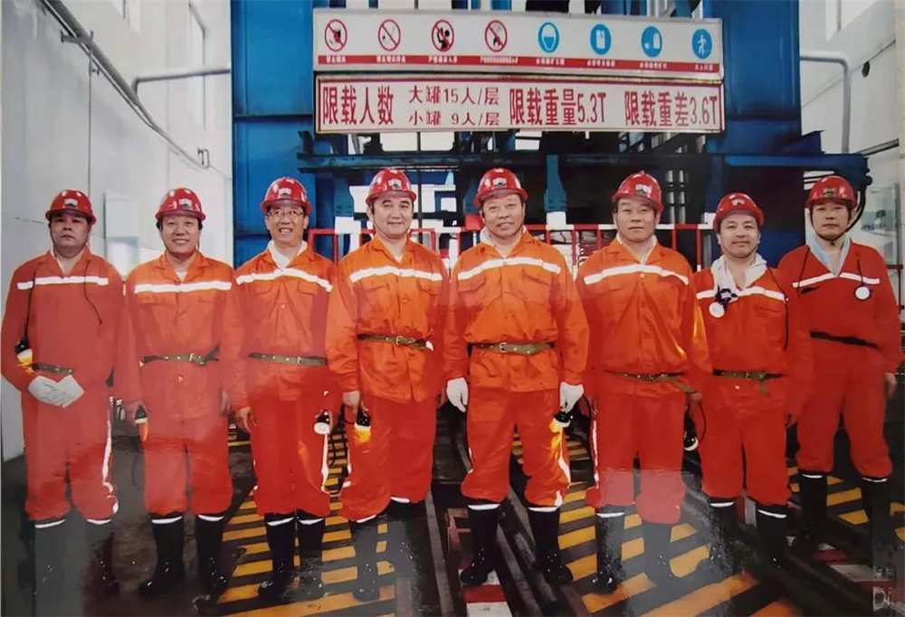 2010年前后,吳承鑒(左五)與棗莊市煤監(jiān)局、煤炭局同志一起深入井下檢查煤礦安全生產(chǎn)。