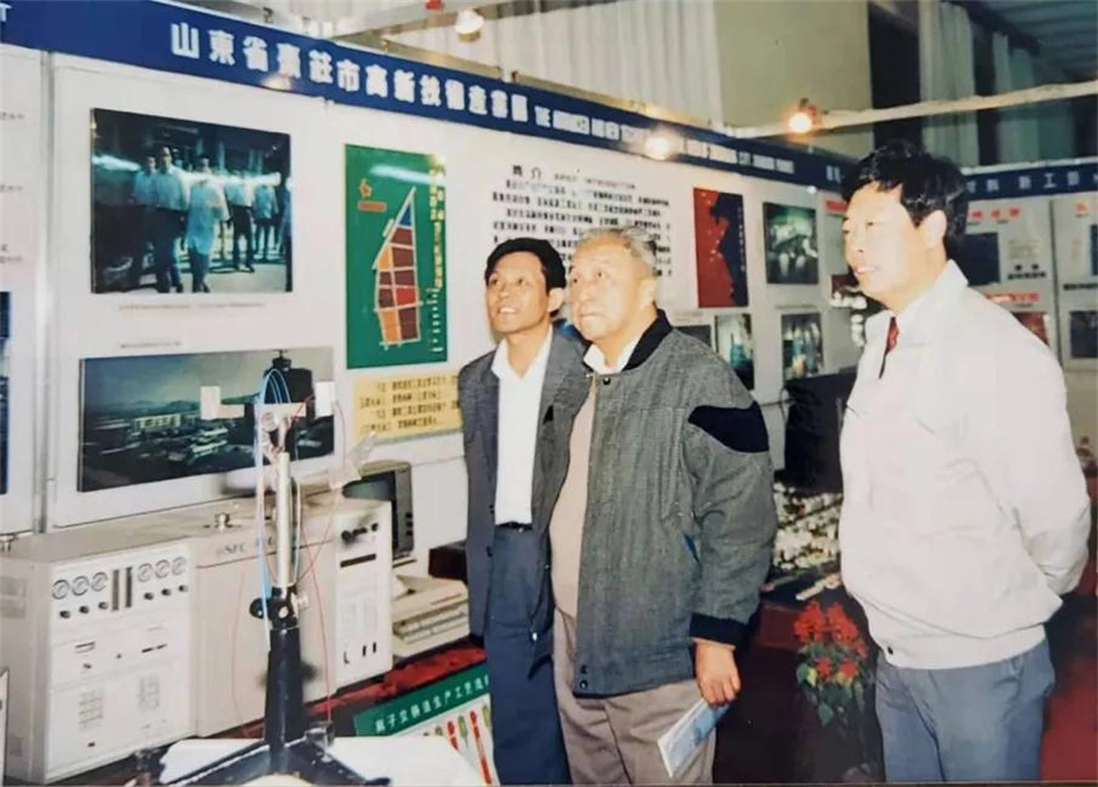 1991年,在全國高新區(qū)匯報(bào)展覽會(huì)上,吳承鑒(右一)和省科委副主任兼棗莊市副市長陸巽生(左一)陪同國家科委常務(wù)副主任李緒鄂(中)觀看棗莊高新區(qū)展區(qū)。
