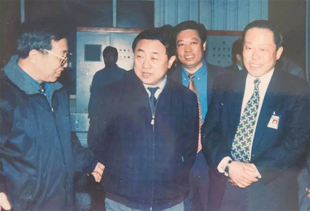 2000年3月,時(shí)任山東省常務(wù)副省長韓寓群(中)視察青啤集團(tuán)薛城公司,青啤集團(tuán)董事長李桂榮(左一)、薛城公司總經(jīng)理王連法(右一)陪同。右二為吳承鑒。