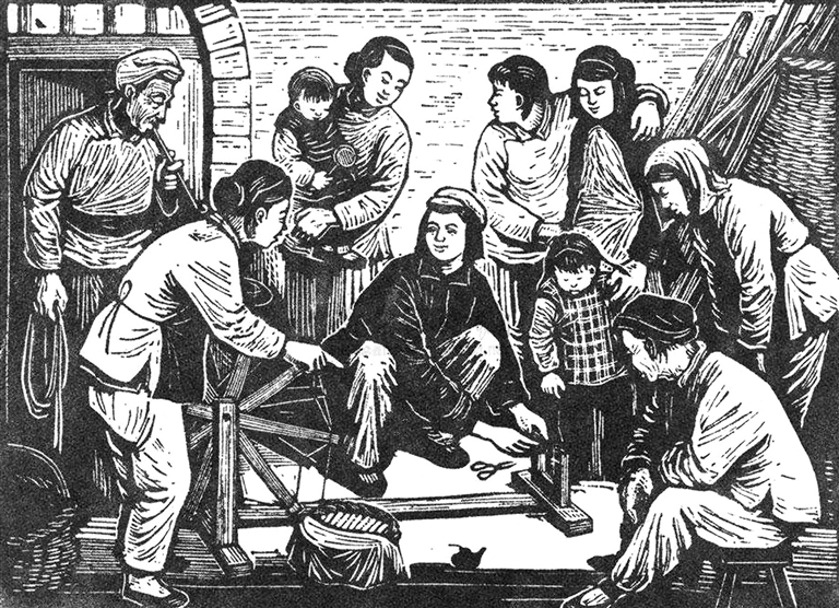 圖為畫家力群創(chuàng)作的反映大生產運動的版畫《幫群眾修理紡車》。(資料圖片)